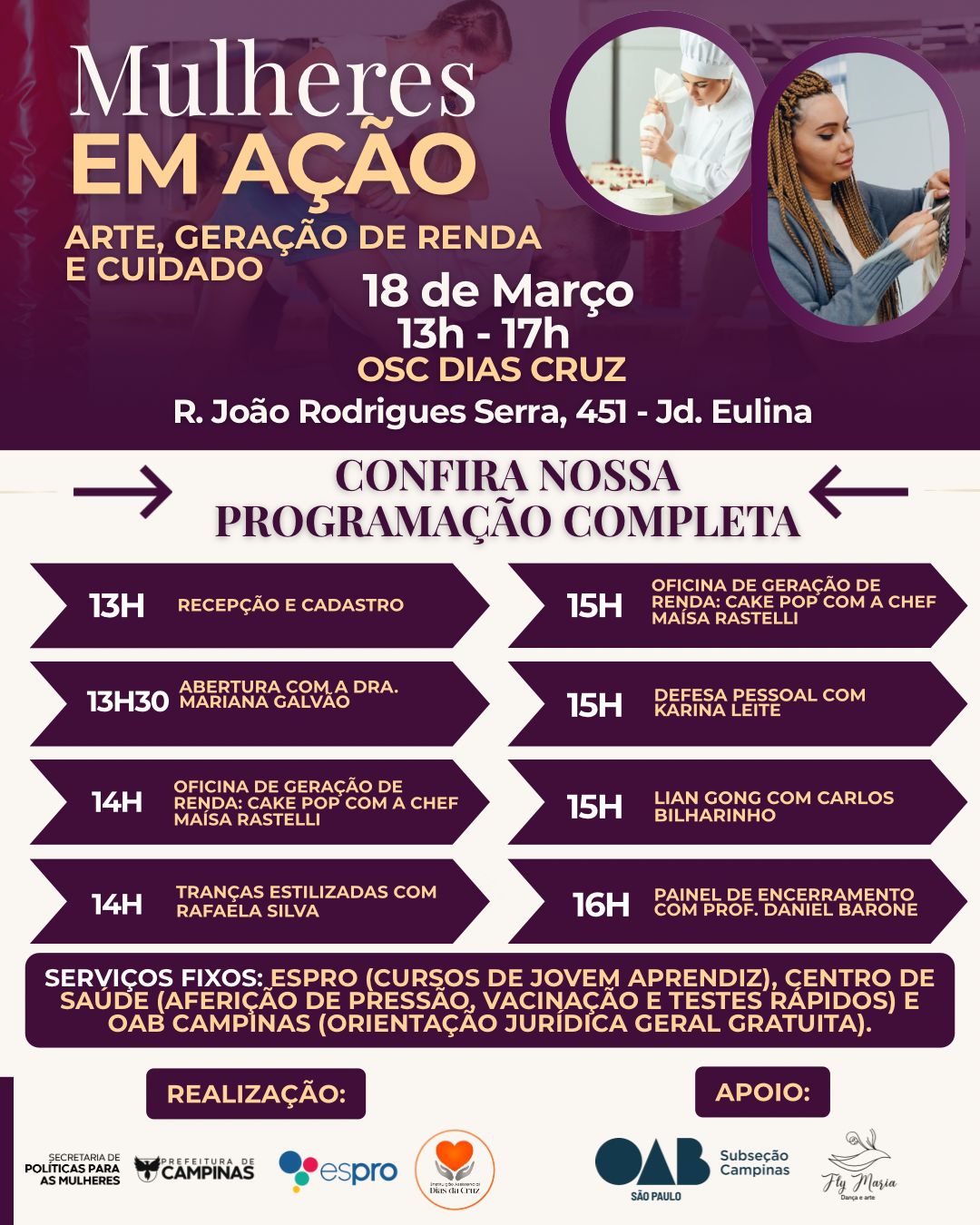 A iniciativa conta com realização da OSC Dias Cruz, do Espro – Ensino Social Profissionalizante, da Secretaria de Políticas para as Mulheres de Campinas e da Prefeitura de Campinas, além do apoio da OAB Campinas e da Fly Maria Dança e Arte. A participação é gratuita e aberta à comunidade.