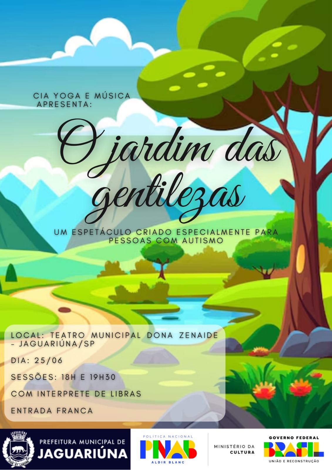 Nesta quarta-feira, 25, o palco do Teatro Municipal Dona Zenaide, em Jaguariúna, recebe o espetáculo infantil “O Jardim das Gentilezas”, da Cia. Yoga e Música. Com entrada gratuita, a peça será exibida em duas sessões: às 18h e às 19h30, e contará com intérprete de Libras, garantindo acessibilidade para todos os públicos.