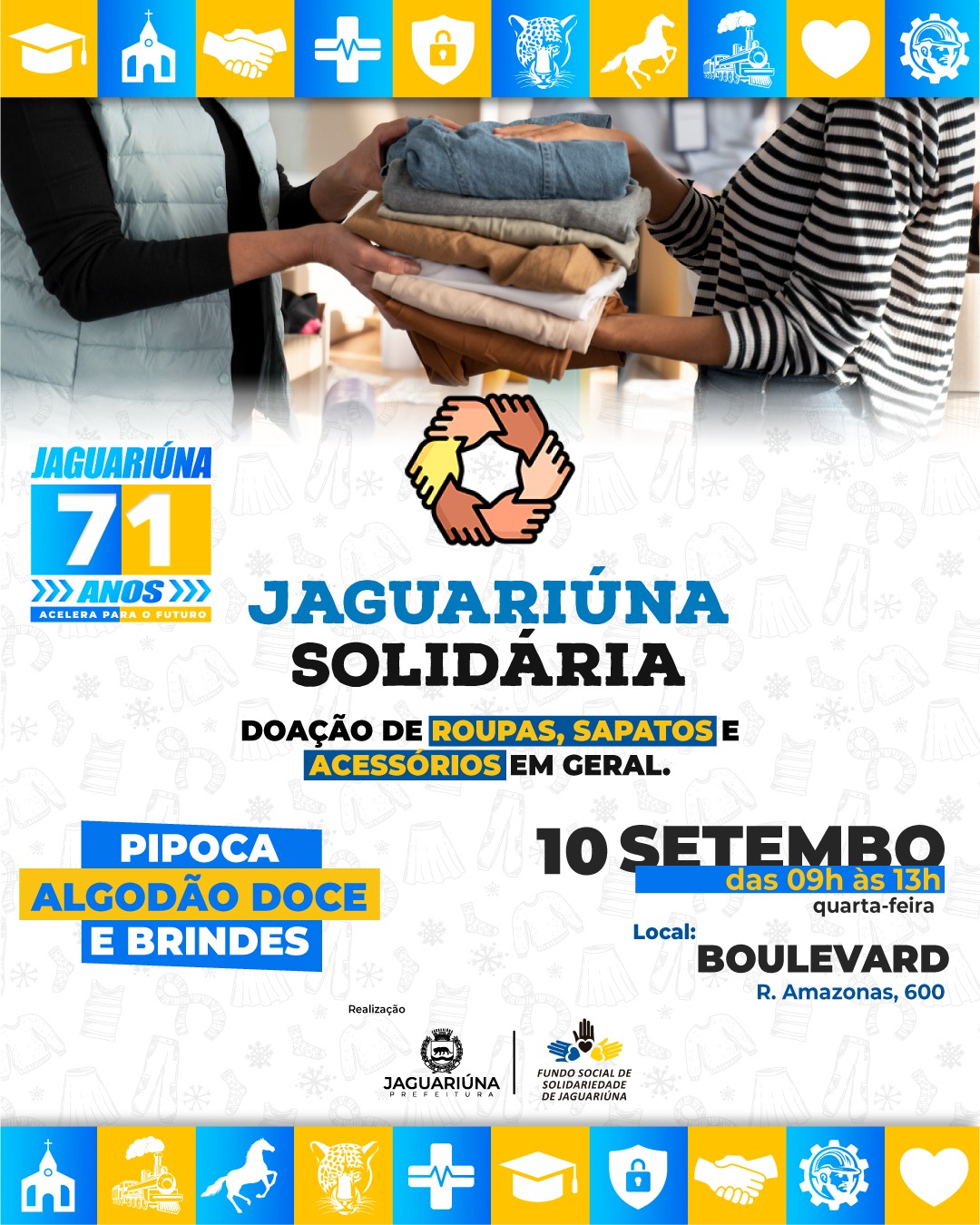 Nesta quarta-feira, 10, o programa Jaguariúna Solidária ganha uma edição especial em celebração ao aniversário do município. A ação será realizada das 9h às 13h, no Boulevard do Centro Cultural, e promete oferecer um dia festivo para toda a população.