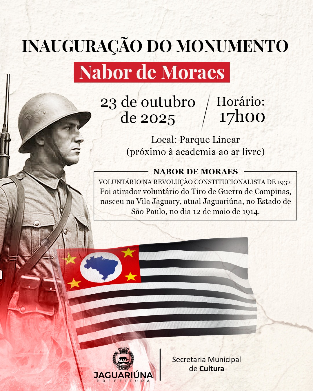 Jaguariúna vai inaugurar nesta quinta-feira, 23, às 17h, no Parque Linear próximo à academia ao ar livre, o monumento em homenagem a Nabor de Moraes, soldado jaguariunense morto durante a Revolução Constitucionalista de 1932.