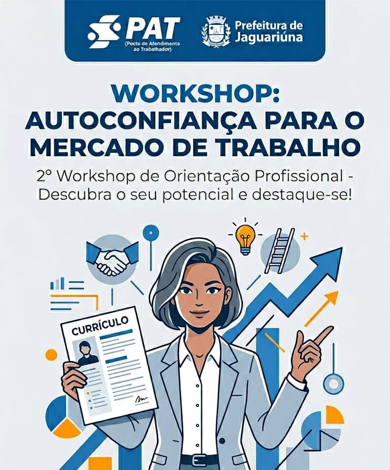 O Posto de Atendimento ao Trabalhador (PAT) de Jaguariúna irá promover no próximo dia 15 de abril (quarta-feira), das 13h30 às 15h30, o 2º Workshop “Autoconfiança para o Mercado de Trabalho”, desta vez com o enfoque “Descubra o seu potencial e destaque-se”.