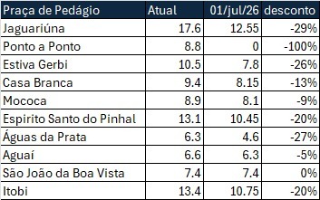 Com o leilão da Rota Mogiana confirmado, a nova concessão começa com redução nas tarifas das praças atuais, com quedas que chegam a 29% em alguns trechos. A medida integra a política do Governo de São Paulo de padronização da tarifa quilométrica, que estabelece valor menor e uniforme por quilômetro percorrido em todo o Estado.