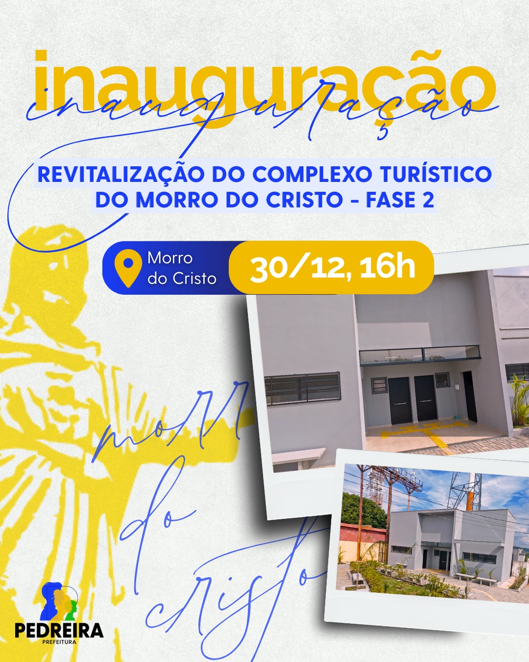 A Prefeitura de Pedreira, por meio de sua Secretaria de Divulgação e Turismo, em parceria com o Governo do Estado, representando pela Secretaria de Turismo e Viagens, realiza na terça-feira, 30, às 16h, a entrega oficial da Fase 2 das obras de Revitalização do Complexo Turístico do Morro do Cristo.
