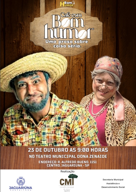 A Secretaria Municipal de Assistência e Desenvolvimento Social de Jaguariúna, em parceria com o Conselho Municipal do Idoso, realiza no próximo dia 23 de outubro, às 9h, no Teatro Municipal Dona Zenaide, o espetáculo teatral “Café com Bom Humor”, que aborda de forma leve e emocionante o tema do combate à violência contra a pessoa idosa.