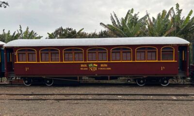 Carro de passageiro que circula nesse trem e recebeu uma pintura especial em alusão ao trem internacional que teve na década de 60 Você sabia que...